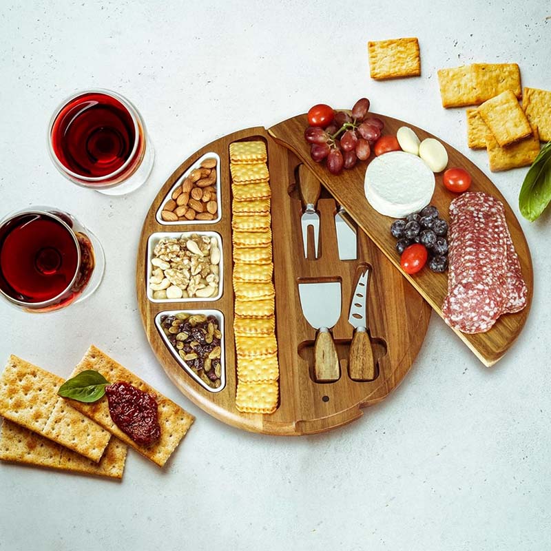 All-in-One Set: This set includes 4 knives and 3 ceramic bowls, ensuring you have everything you need to serve a variety of delicacies. The board provides ample space while remaining portable. Segmented compartments accommodate various items like charcuterie, cheese, sauces, nuts, snacks, and fruits.