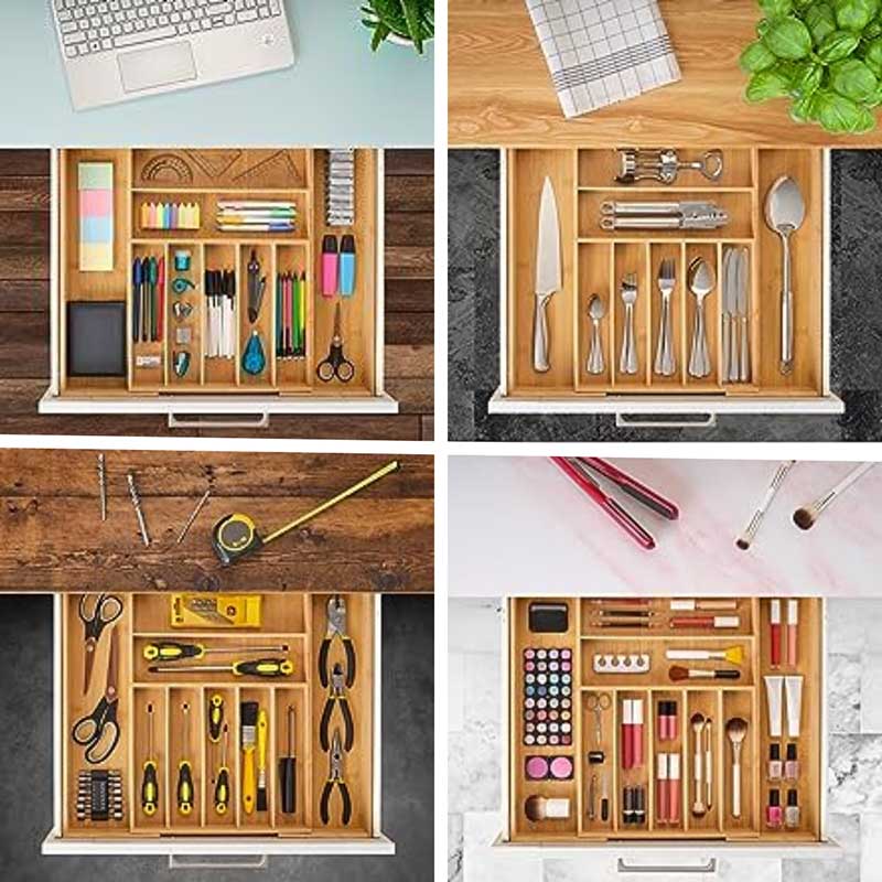 EXTRA COMPARTMENTS WITH MORE ORGANIZATION – Stylishly organize your life with this extra-compartmentalized drawer organizer! This bamboo utensil holder is great for organizing your silverware, office supplies, or jewelry. You'll love the extra compartments that help you get more organized than ever before.