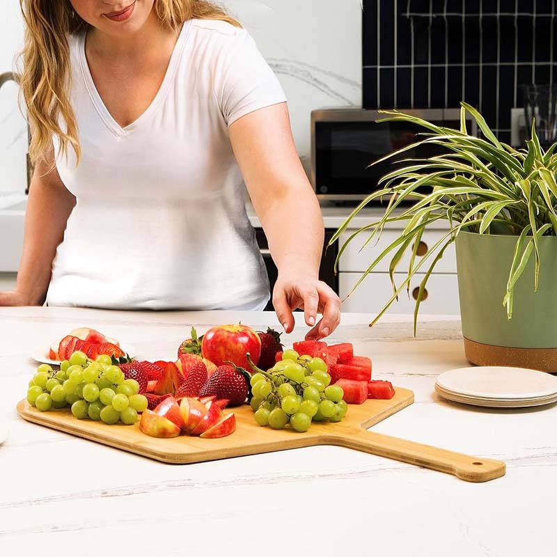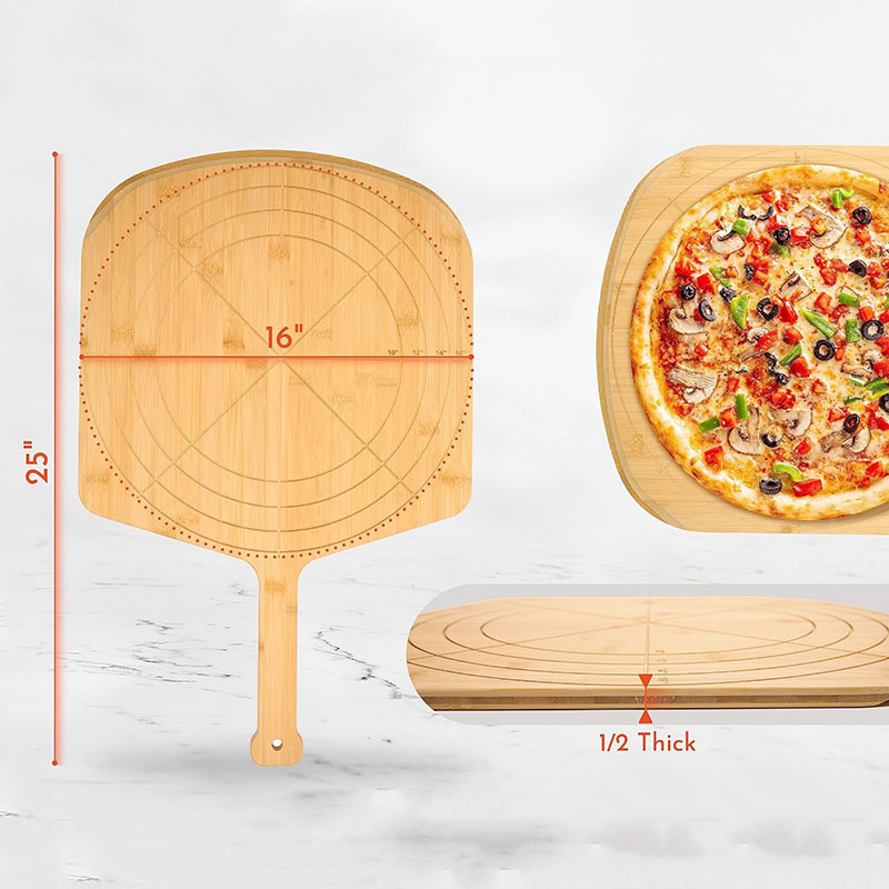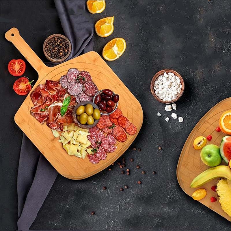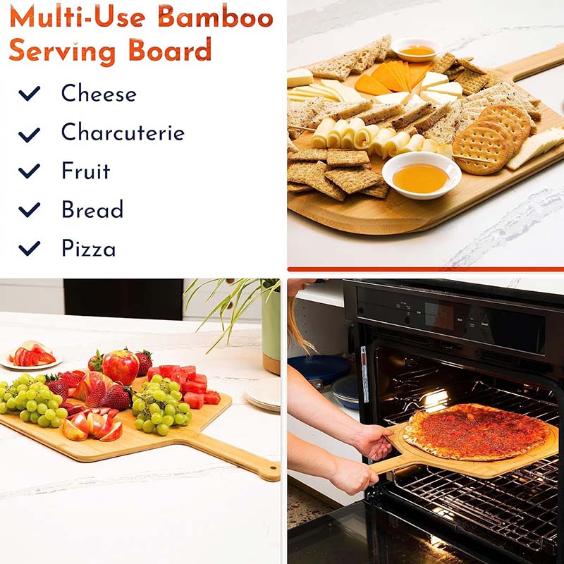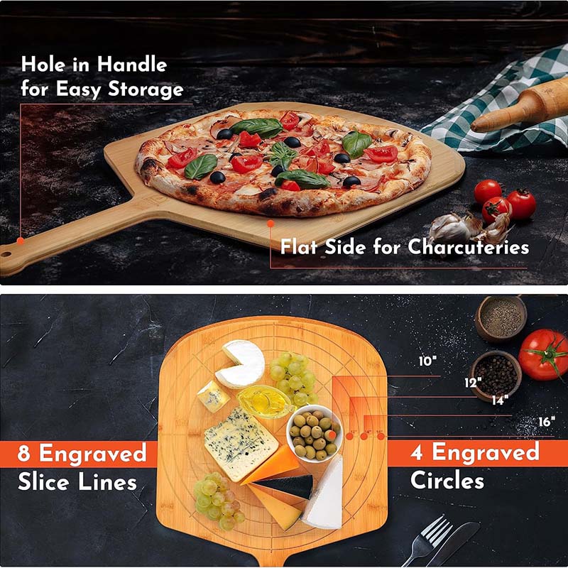 Elevate your pizza-making experience with our outstanding wooden pizza board. Not only does it function flawlessly as a pizza peel, but it also serves as a versatile cutting board for pizzas, fruits, and vegetables. Plus, it doubles as an elegant cheese board, charcuterie board, or a stylish way to serve appetizers to your guests. Prepare to take your culinary skills to the next level with a essential kitchen accessory.