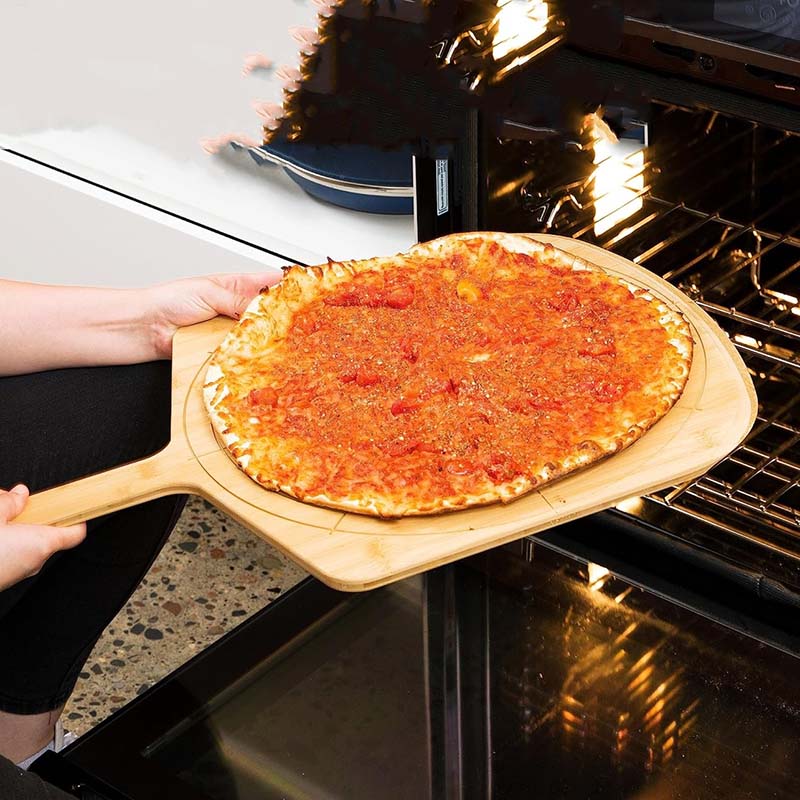 Our pizza peel is crafted with a paddle shape, specifically designed with a sleek beveled edge that allows for effortless transfer of pizzas from the oven. The ergonomic handle of this pizza board ensures a secure and comfortable grip, making it ideal for effortlessly lifting pizzas, breads, cakes, and other baked goods.