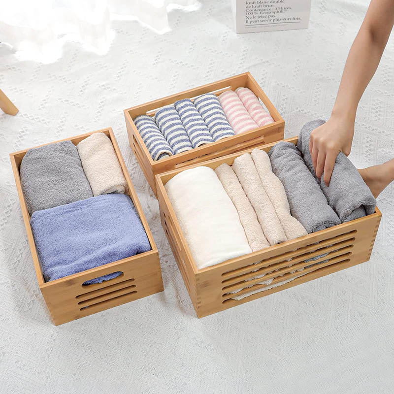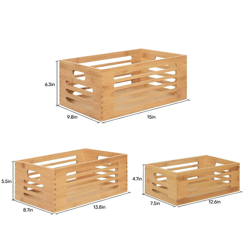 Includes 3 pack bamboo storage bins, 1 large 1 medium and 1 small.
