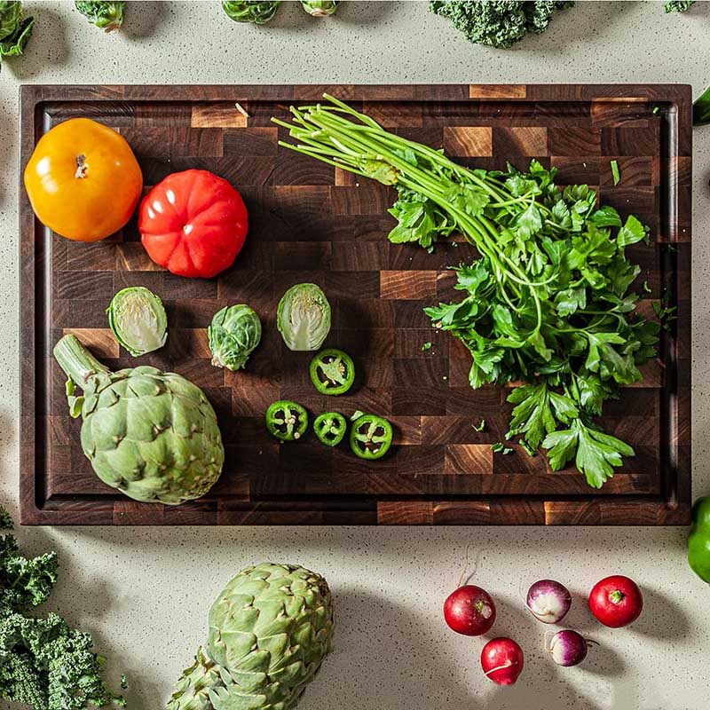 KNIFE-FRIENDLY SURFACE, DURABLE END GRAIN: The butcher blockcutting board is the ideal surface for cutting and chopping without damaging your knives. Its end grain design not just adds to the board's aesthetic charm, it enhances durability as well.