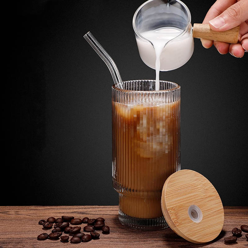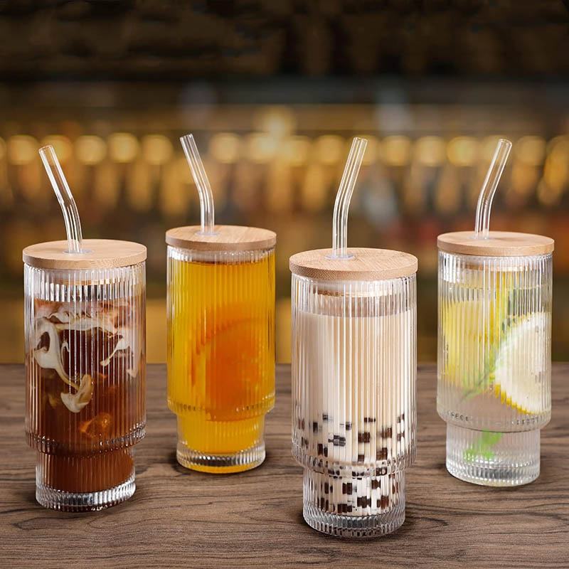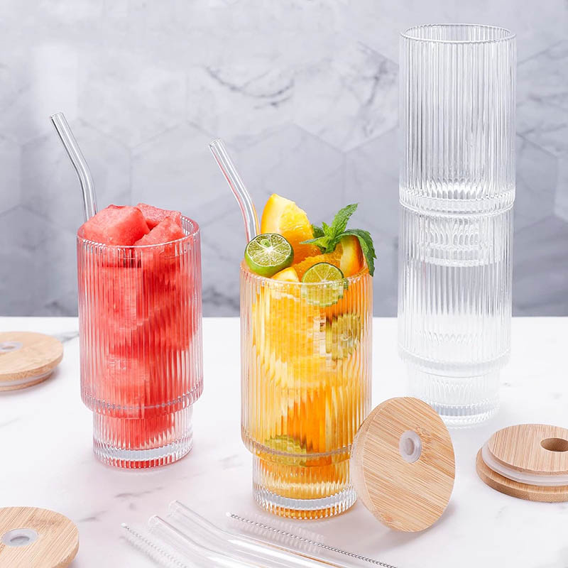 16OZ Glass Cups with Lid and Straw- The glass set includes: 4 PCS Ribbed Glass Cups, 4 PCS Bamboo Lids, 4 PCS reusable glass straws, 1PCS cleaning brush.