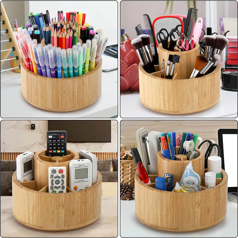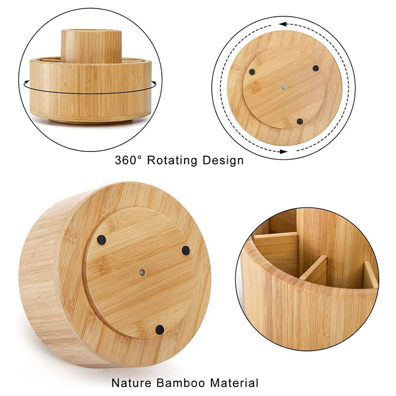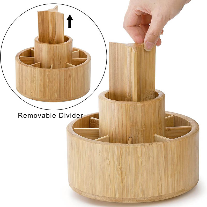 Large Capacity, Easy to access: Round bamboo desktop organizer divided into 8 equal-sized compartments and plus a longer center with a removable divider; Easy to store and access your item