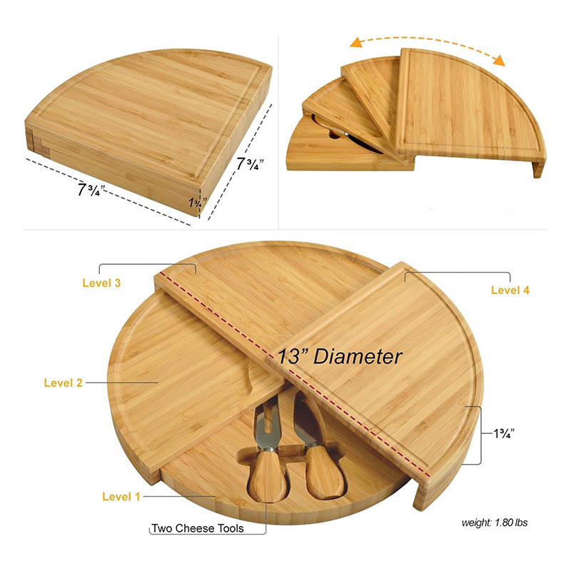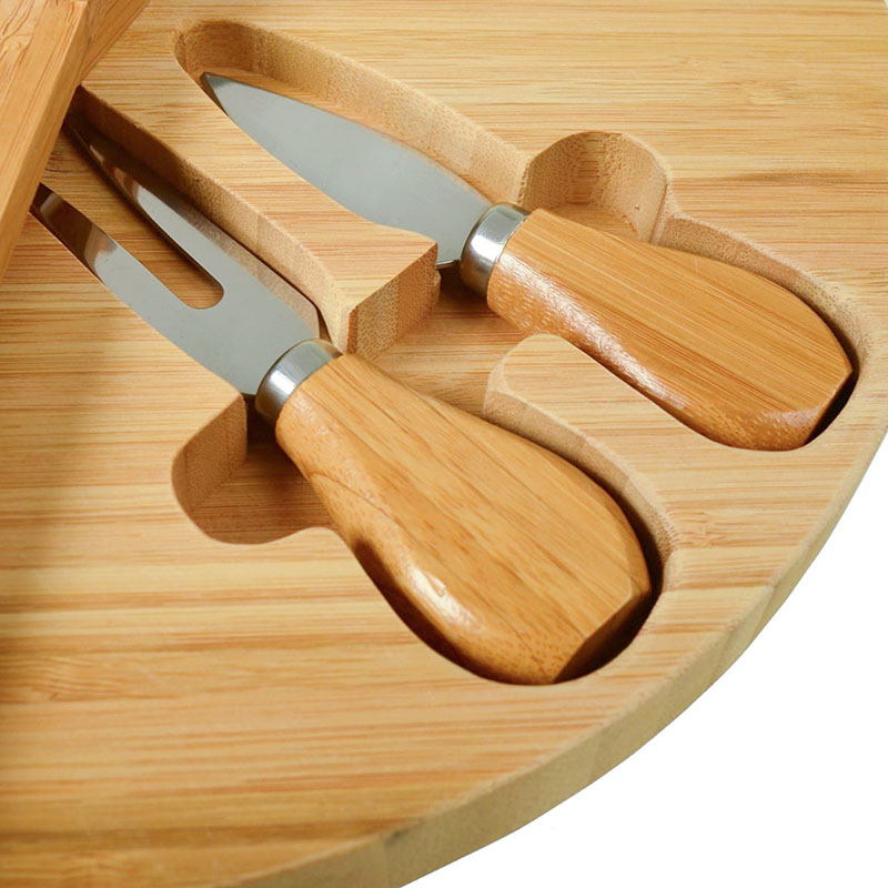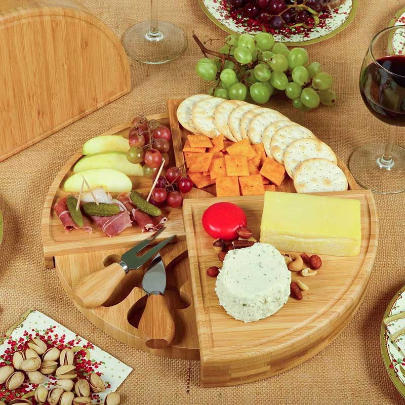 Hidden cutlery: This unique cheese board set features a convenient hidden inset drawer containing all necessary serving accessories, very easy to storage. Our bamboo cheese board set built in storage for easy hosting even on the outdoor.