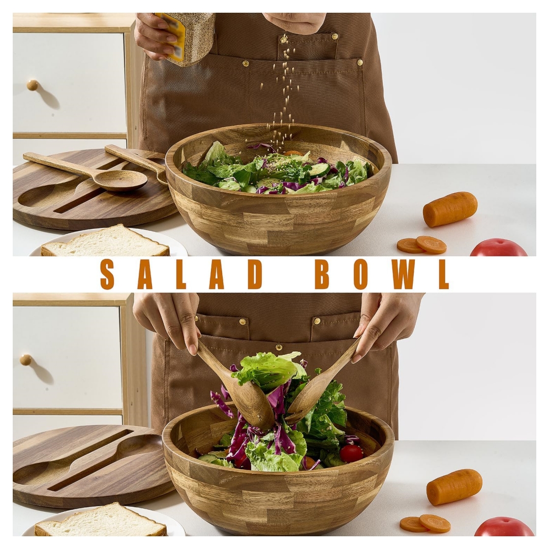 【Premium Acacia Wood】: Handcrafted from durable, natural Acacia wood, this acacia wood bowl showcases rich tones and a distinctive knot pattern that brings rustic beauty to your kitchen. Designed to last, this wooden salad bowl set is a timeless piece that complements any setting from cozy dinners to festive feasts
