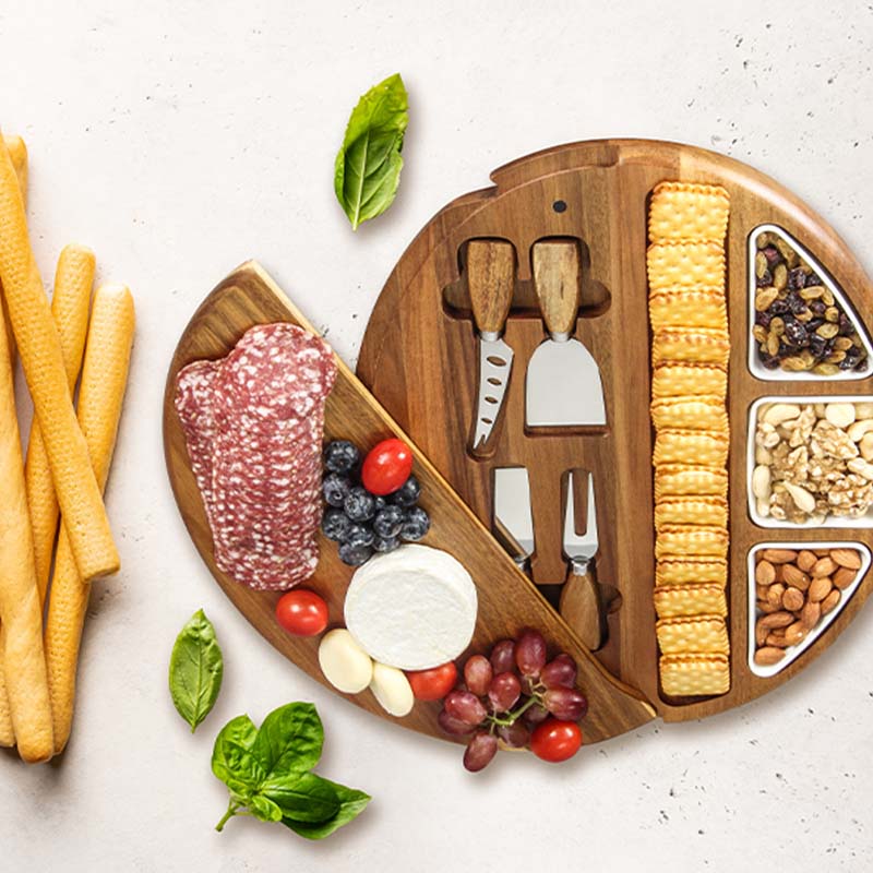 All-in-One Set: This set includes 4 knives and 3 ceramic bowls, ensuring you have everything you need to serve a variety of delicacies. The board provides ample space while remaining portable. Segmented compartments accommodate various items like charcuterie, cheese, sauces, nuts, snacks, and fruits.