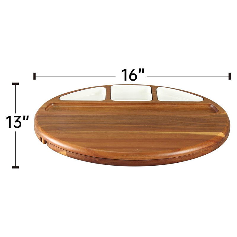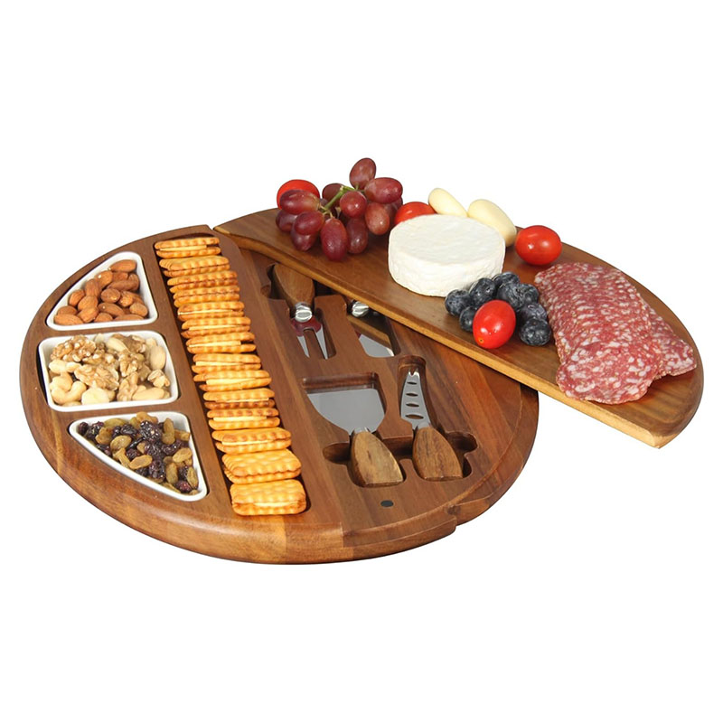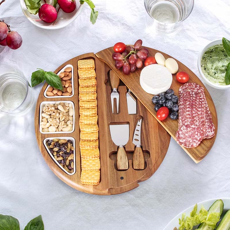 Outstanding Details: The porcelain bowls are removable for easy cleaning, and each has its nest down into the board for organized storage. The knives boast sharp blades and comfortable acacia wood handles. Embedded magnets snap the swivel board securely closed, even when held vertically. A long-lasting stainless steel hinge guarantees smooth operation and longevity.