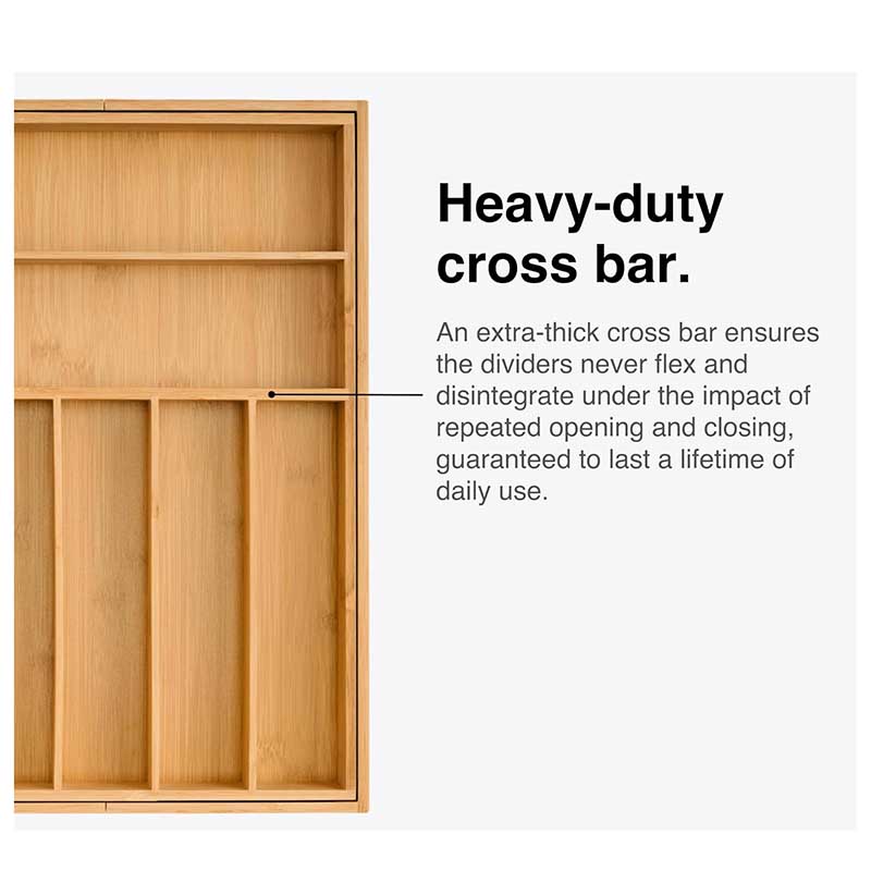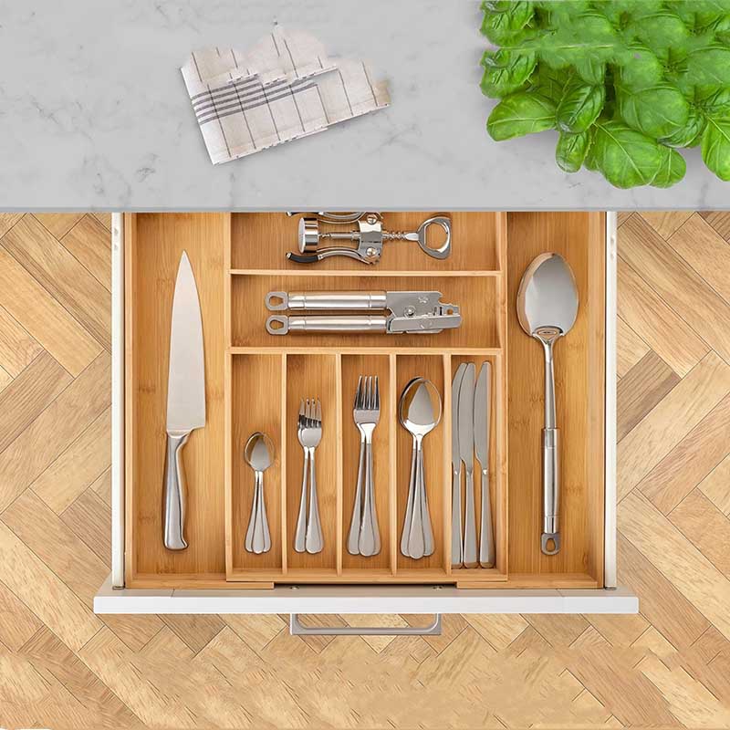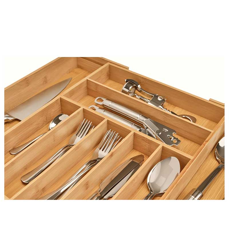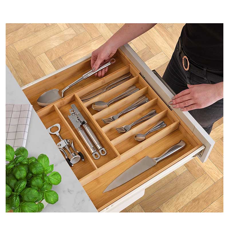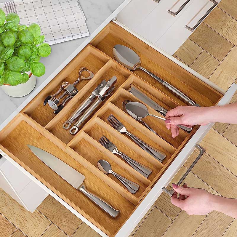 EXTRA COMPARTMENTS WITH MORE ORGANIZATION – Stylishly organize your life with this extra-compartmentalized drawer organizer! This bamboo utensil holder is great for organizing your silverware, office supplies, or jewelry. You'll love the extra compartments that help you get more organized than ever before.