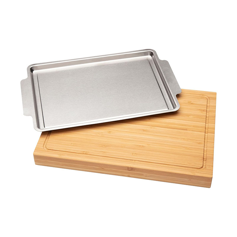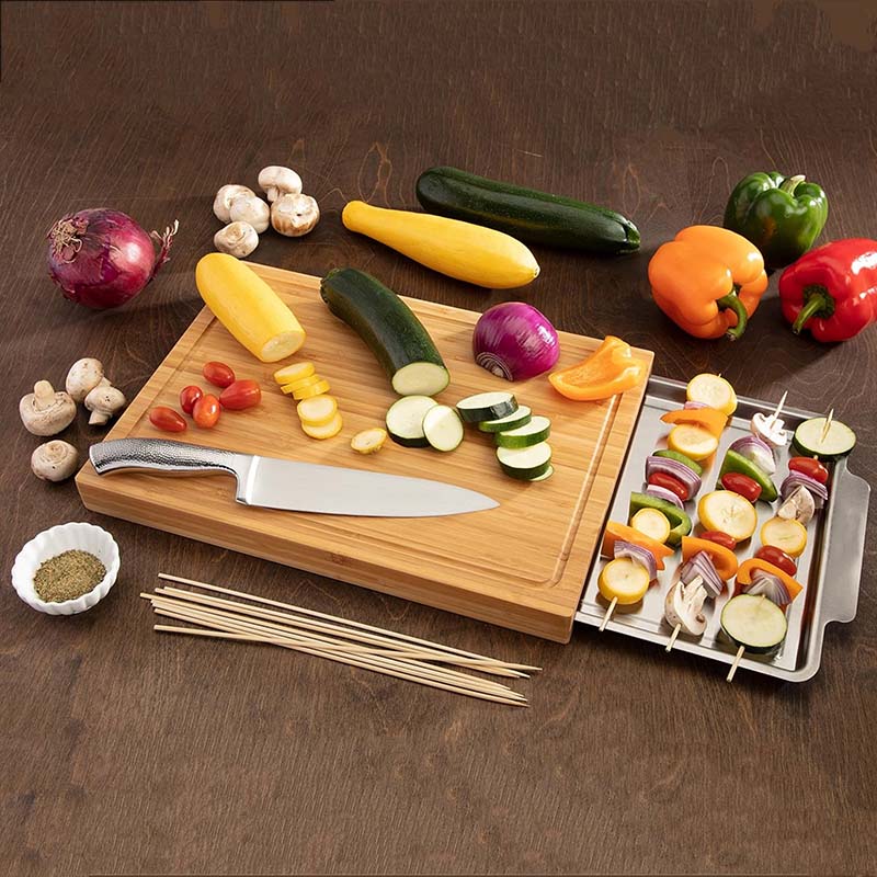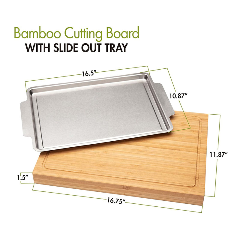 The bamboo cutting board is BPA and Toxin Free. Great for prepping, cutting, serving, and carving. MULTIFUNCTIONAL TRAY: The stainless steel sliding tray can be used easily while prepping meals.