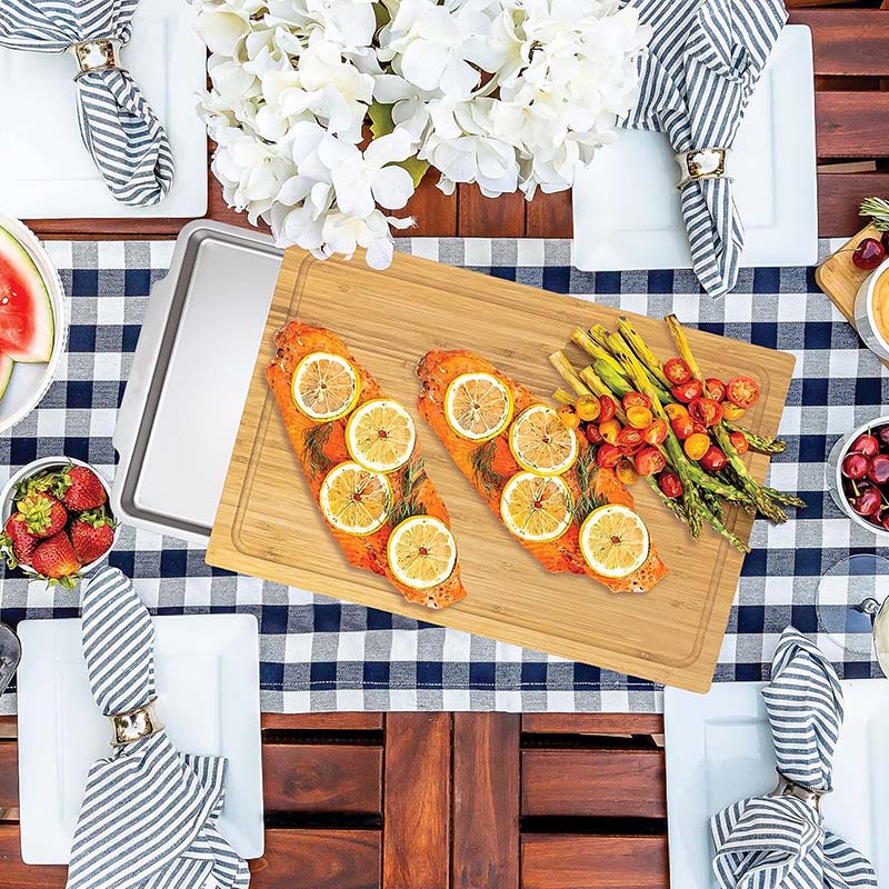 MADE FROM NATURAL BAMBOO: The bamboo cutting board is BPA and Toxin Free. Great for prepping, cutting, serving, and carving.