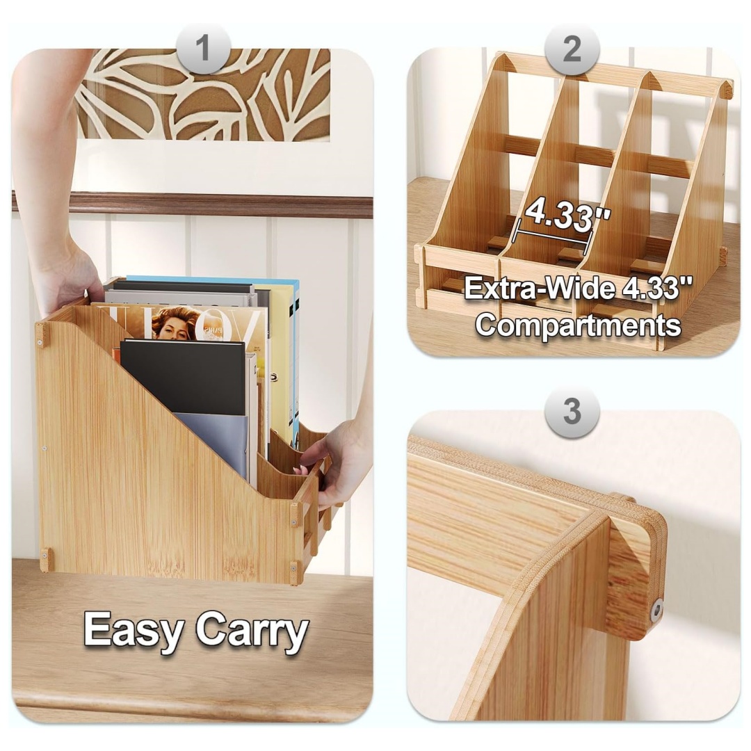 Space Saving: Large capacity wood magazine file holder having 3 compartments for organizing everything on your desktop, saving a lot space for daily work.