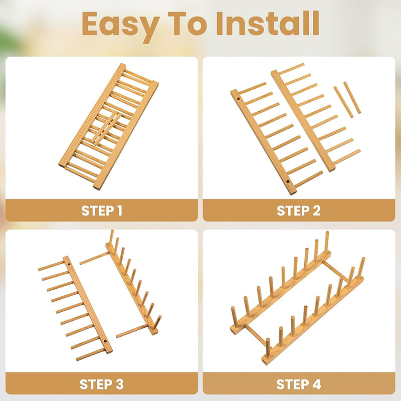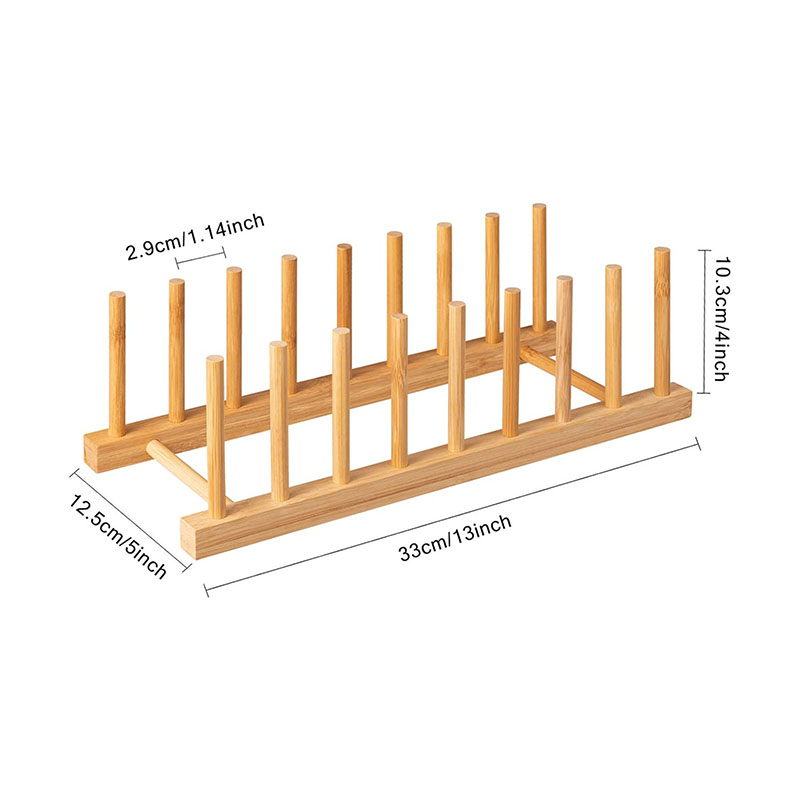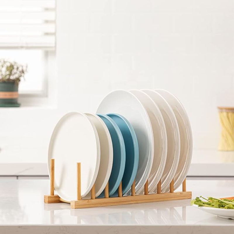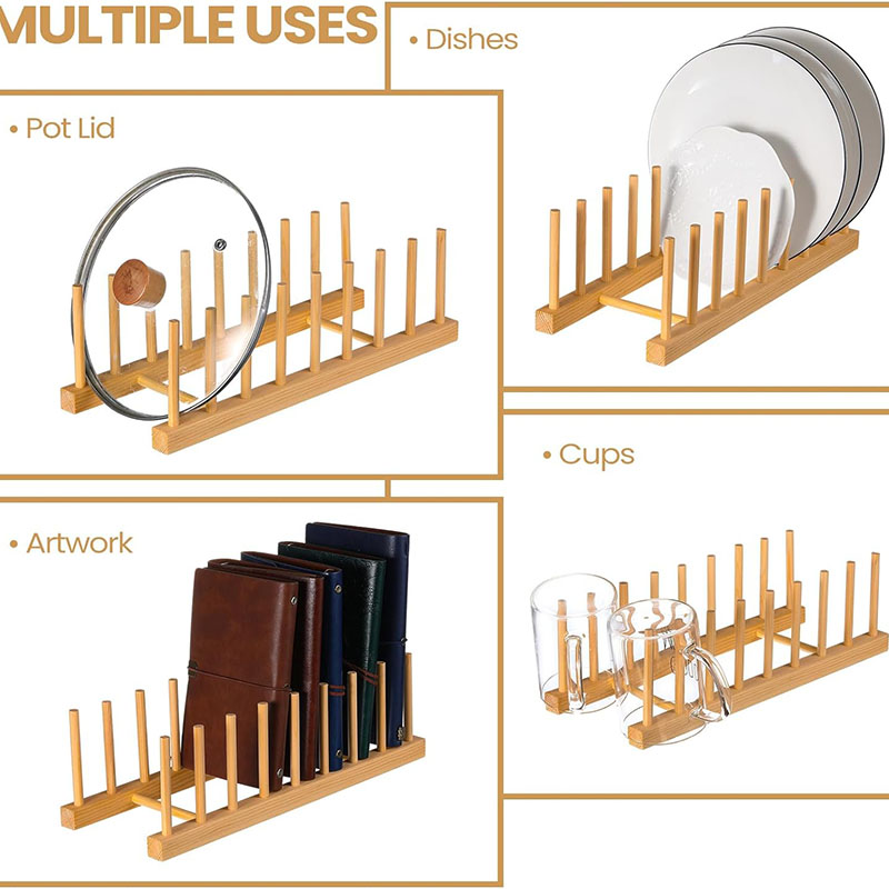 Outstanding Organizer: This bamboo plate rack is ideal for kitchen storage. It accommodates plates and cups of various sizes and also provides storage for pot lids, pans, and cutting boards. Moreover, it can be utilized outside the kitchen, such as for storing books, laptops, trays, and more. The bamboo plate organizer adds a touch of simplistic beauty to your home decor.
