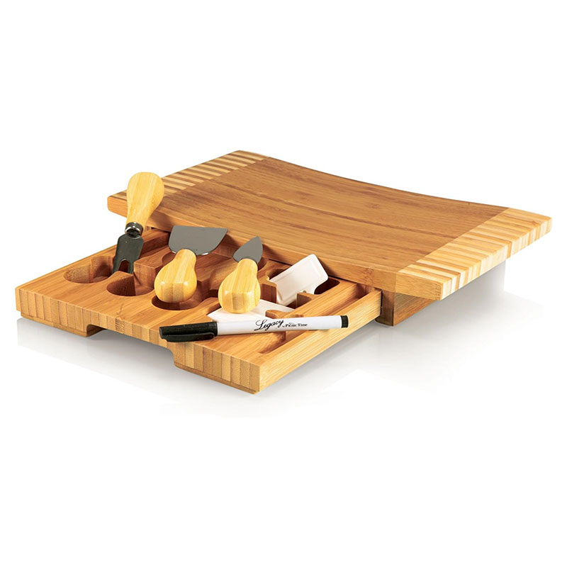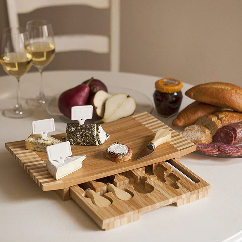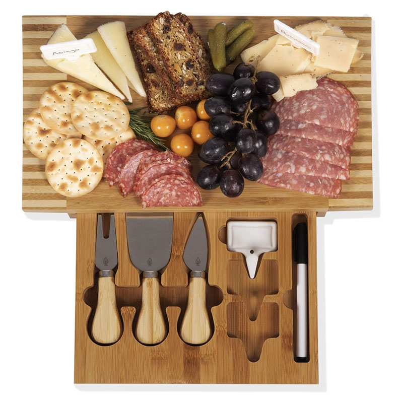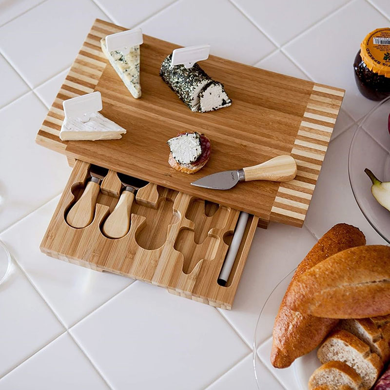 Picnic cutting board features attached drawer where cheese tools securely nest. The travel cheese knife set includes a dual prong fork, chisel knife, and pointed-tip knife.