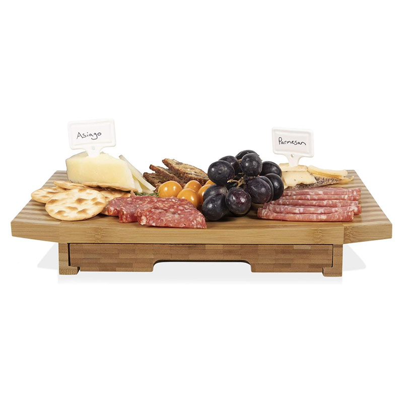 A dark bamboo charcuterie board set with an attached pull-out drawer containing our most essential cheese tools. Ideal for home entertainment, it's the little accents that make this cheese board set the perfect addition to your next dinner party, buffet, or picnic - the recessed center comfortably holds food, the carved-out sections in the drawer hold cheese tools snugly in place, and the included ceramic cheese markers and wet erase pen.
