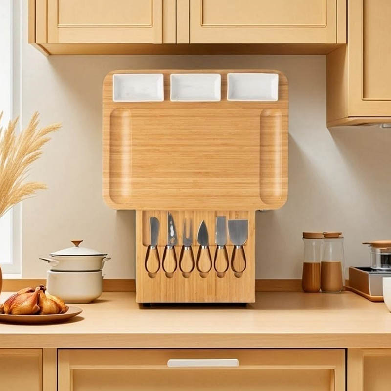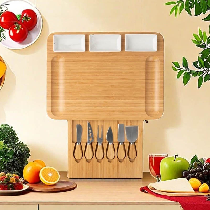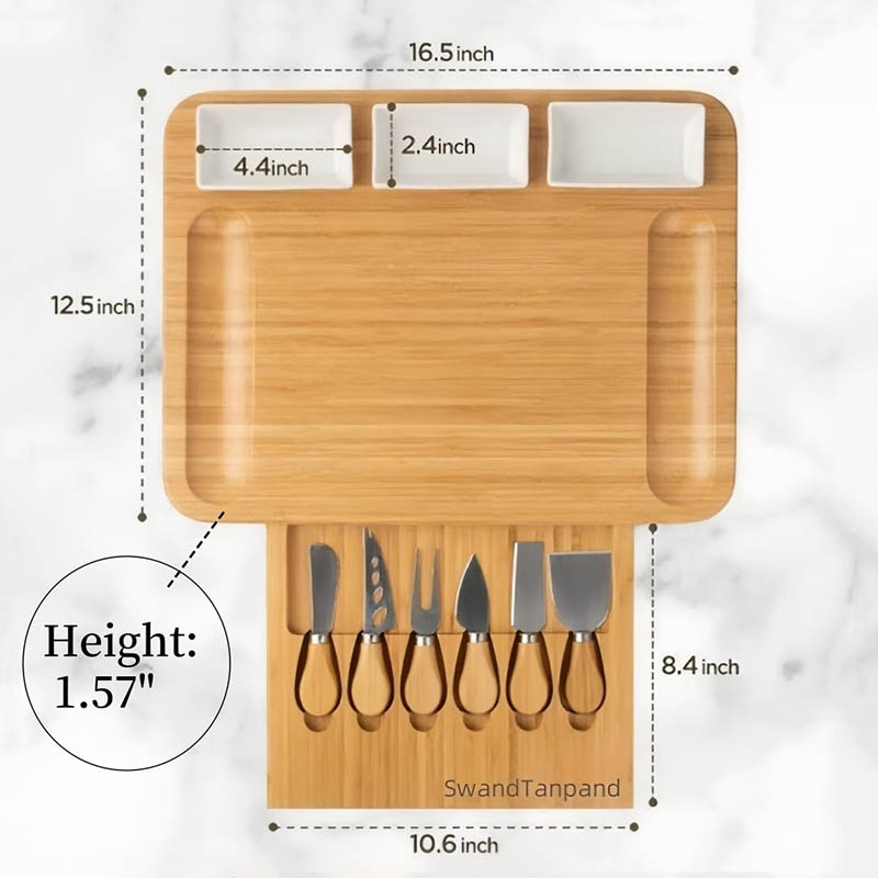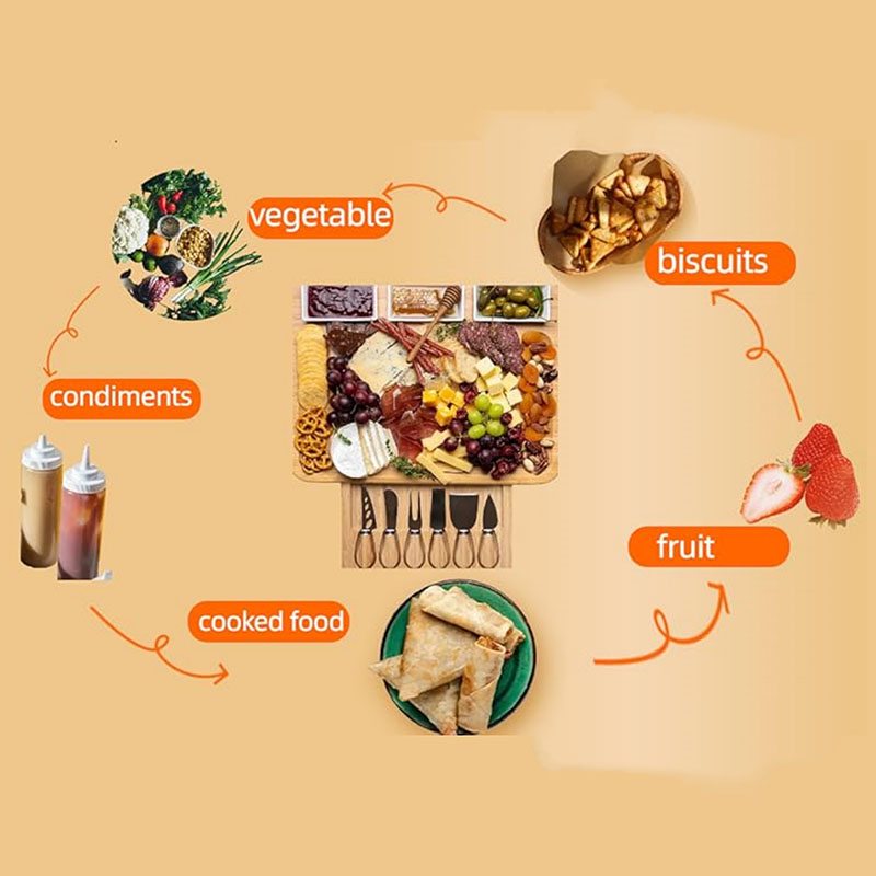 All-in-One charcuterie boards Comes with 6 versatile, food knives and forks (spreaders, cheese knives, picks,fruit), tailored for cheeses, meats, The chauratri board includes a sleek built-in drawer for 6 knife steel cutlery (cutlery)