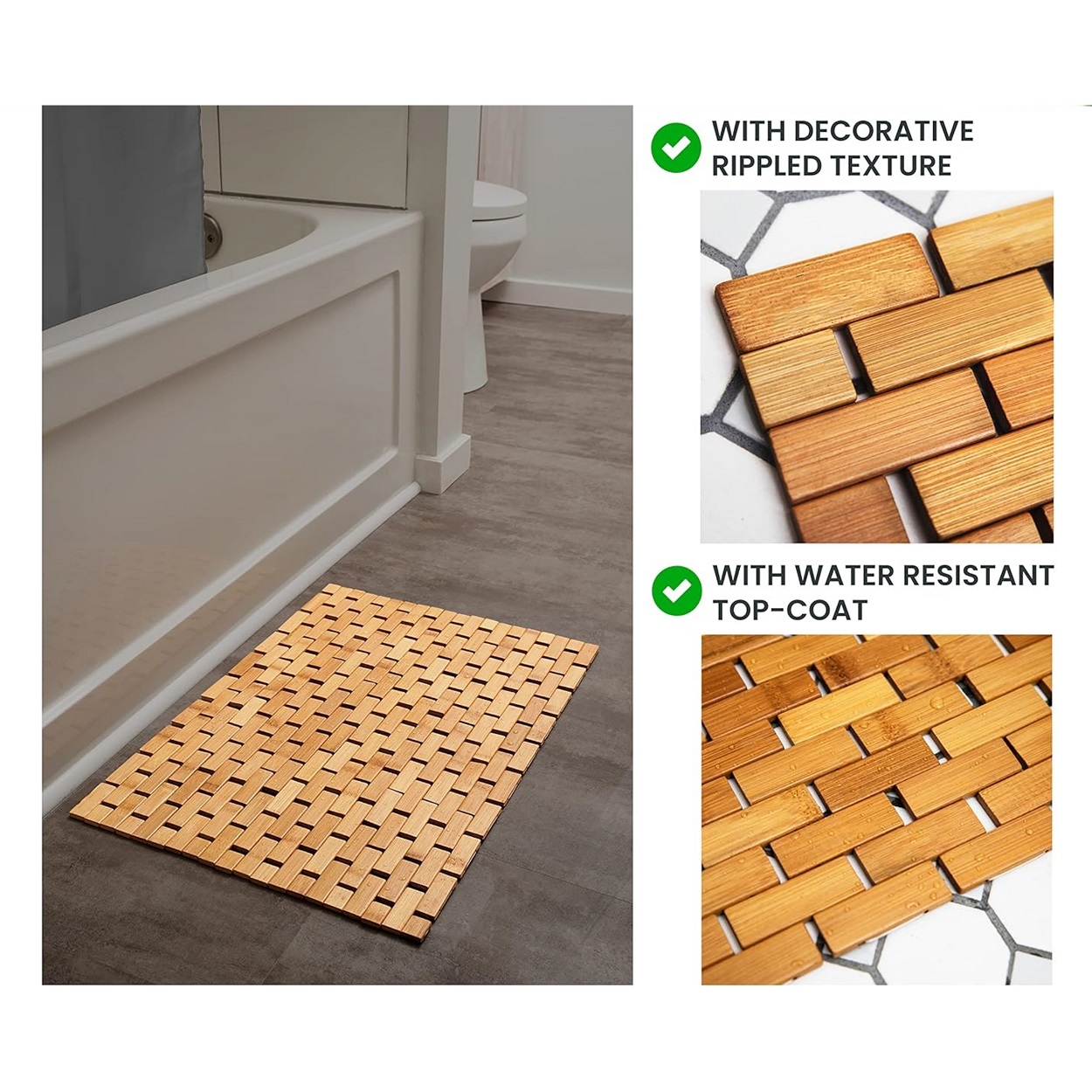 Natural Bamboo Material – Crafted from sustainably sourced bamboo, this bathmat is kiln-dried to resist warping, cracking, and shrinking, ensuring long-lasting durability compared to plastic, rubber, or fabric floor mats. Perfect for enhancing your bathroom decor or as a stylish addition to your bathroom accessories collection.