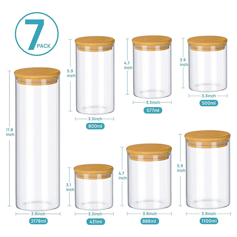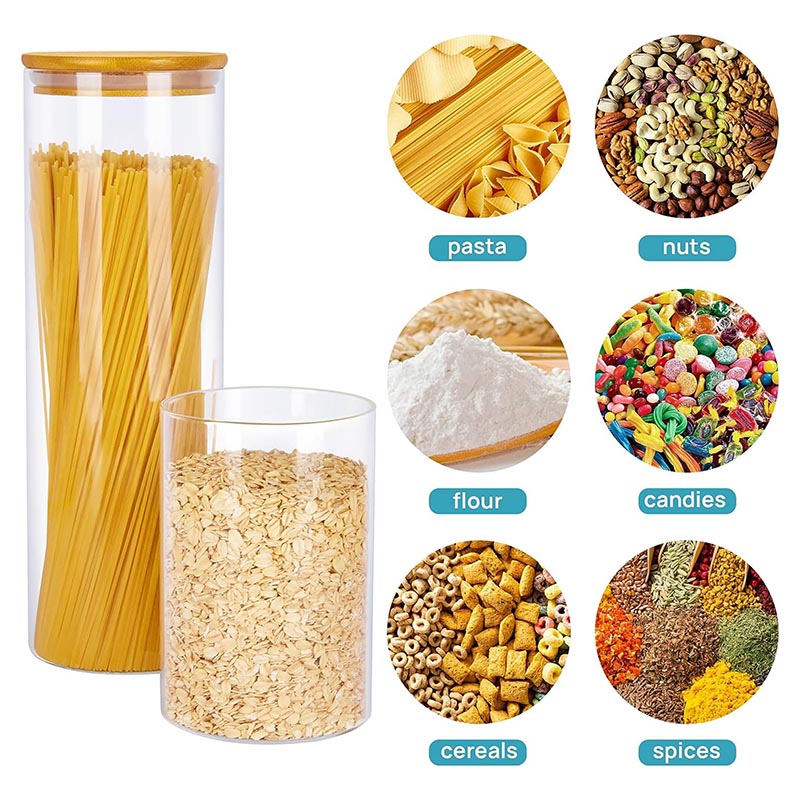 Versatile Glass Canisters: Glass food containers with different volume meet you various storage need; ideal for storing cereals, cookie, snacks, nuts, oat, or even can use these glass jars as candy jar, bath salt jar, spice jar, sugar coffee containers