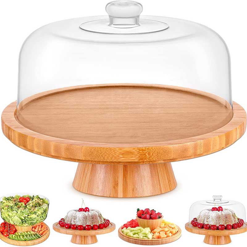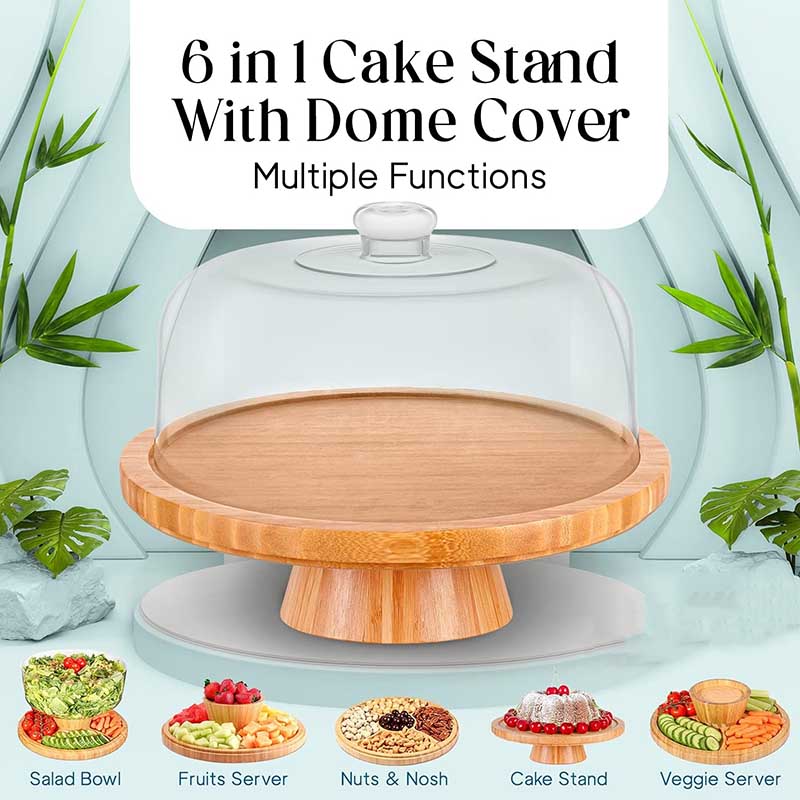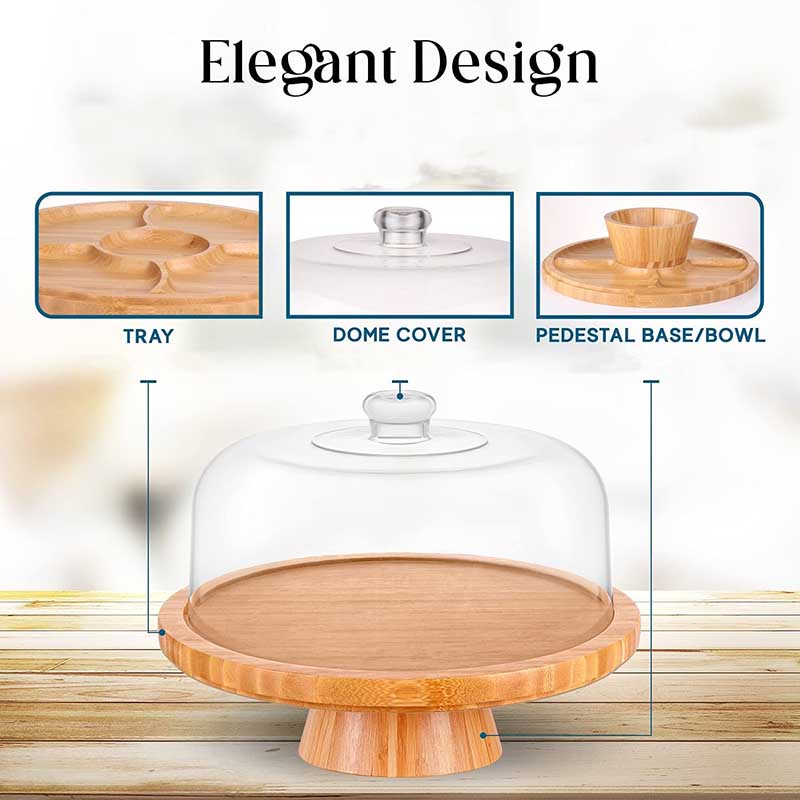 MULTIFUNCTIONAL – This 6 in 1 multipurpose bamboo cake stand with dome is a unique cake stand with many functions and uses. Use it as a cake plate, cake tray, serving dish, punch and salad bowl, chips and salsa plate, and baking goods stand. Simply invert the dome or plate to create any type of serving dish. This spacious 12-inch cake stand is designed to display bakes up to 4 inches tall.