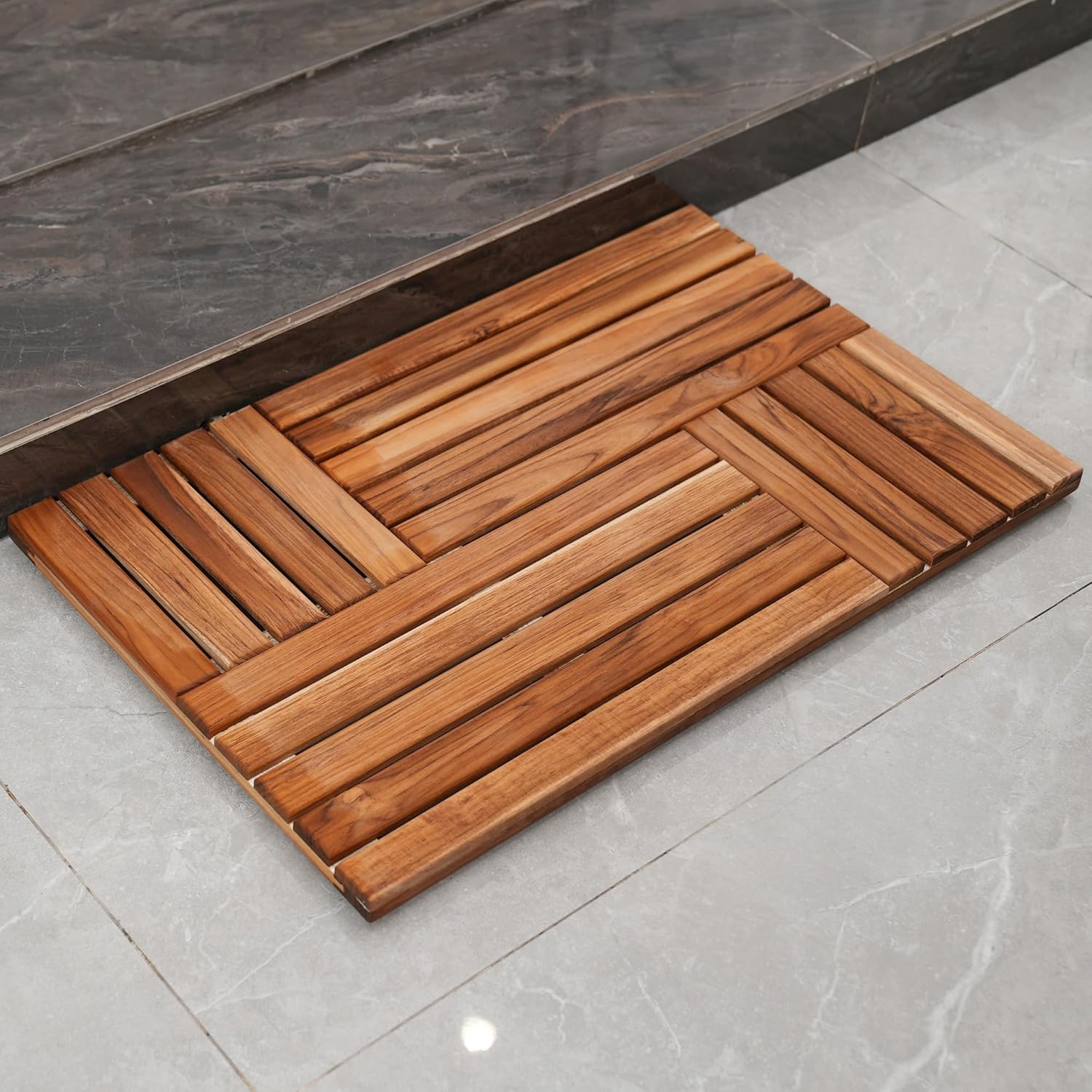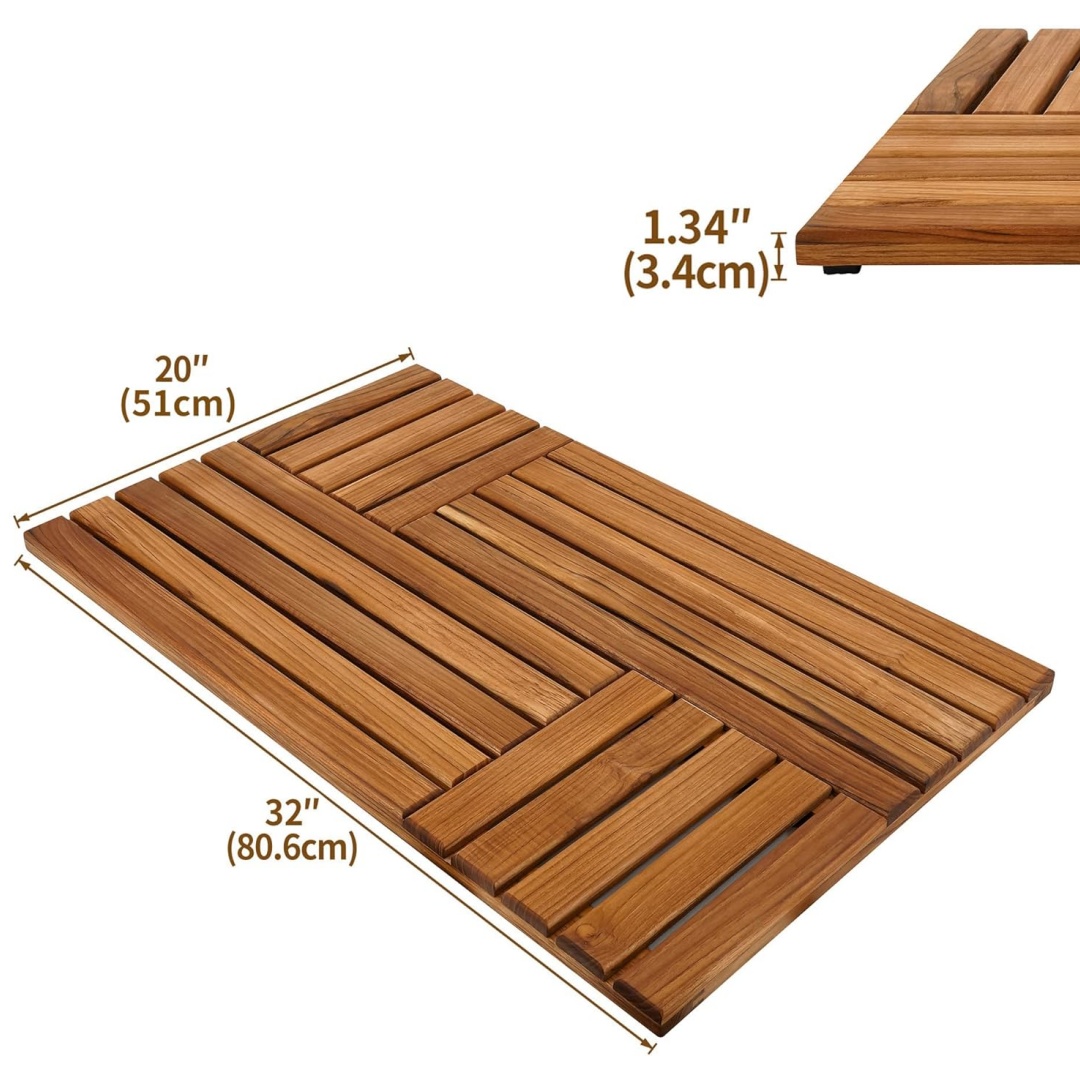 Improved Criss-Cross & Non Slip Design: The crisscrossed wooden shower mat surface is more non-slip than before and wooden mat has slatted surface conduces to drainage. The chamfering edges and the distance between wooden slats make your feet comfortable when standing on the teak shower mat.
