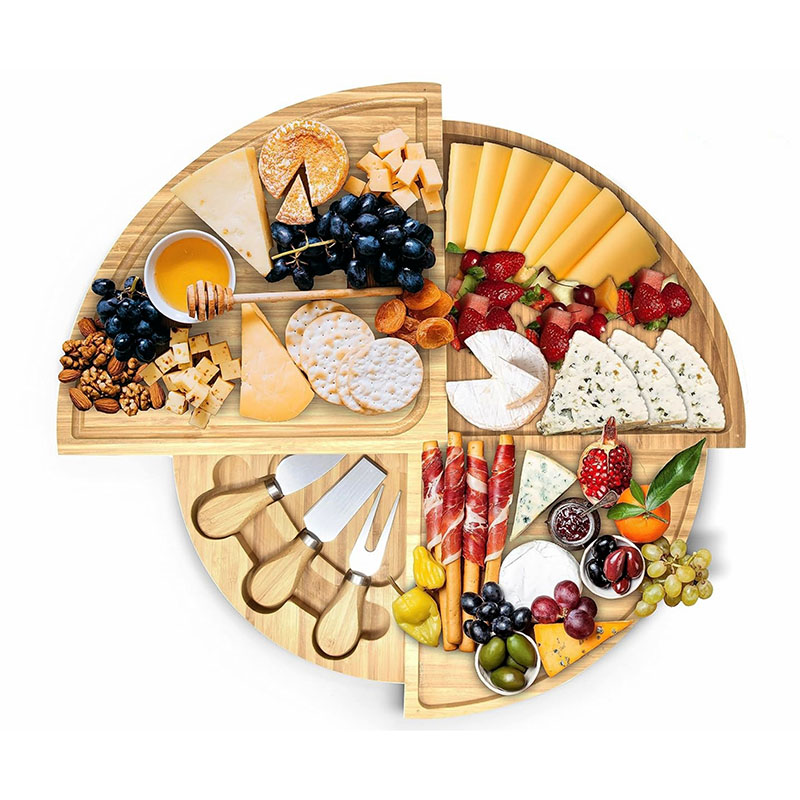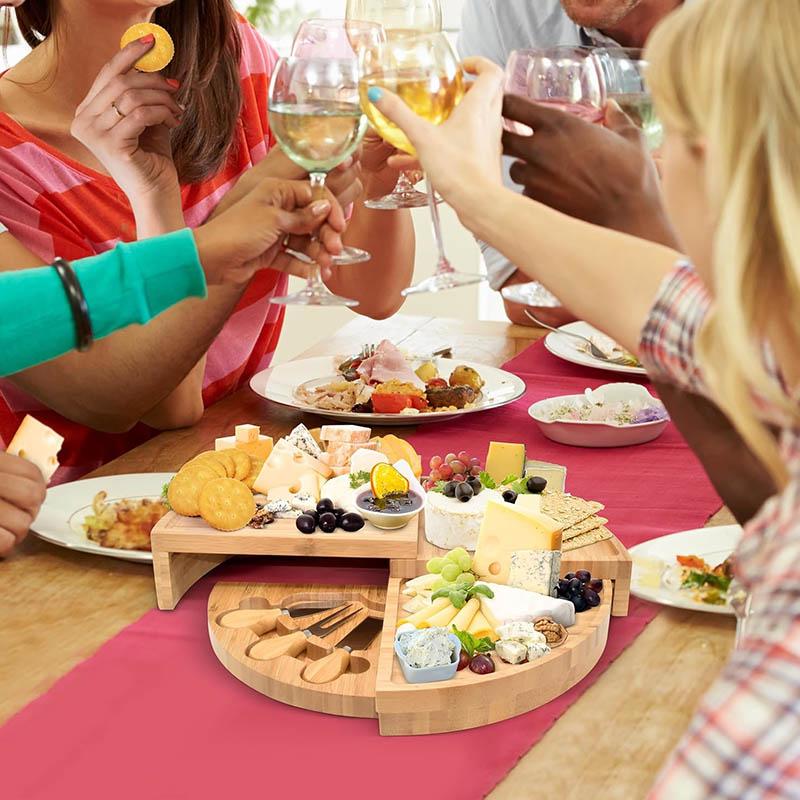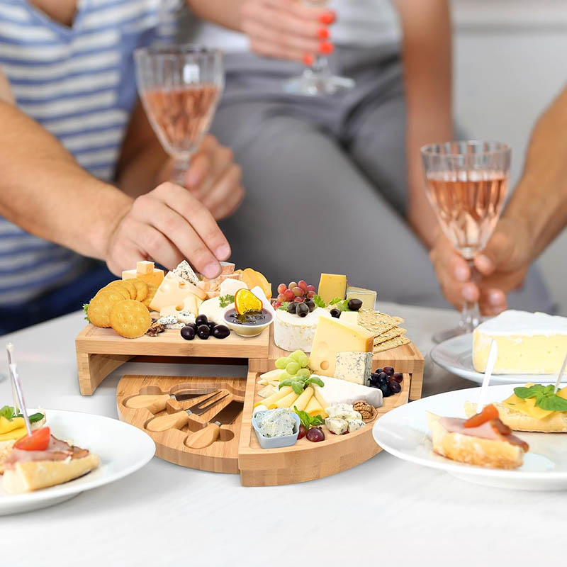 Hidden cutlery: This unique cheese board set features a convenient hidden inset drawer containing all necessary serving accessories, very easy to storage. Our bamboo cheese board set built in storage for easy hosting even on the outdoor.