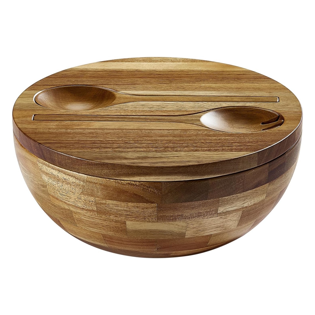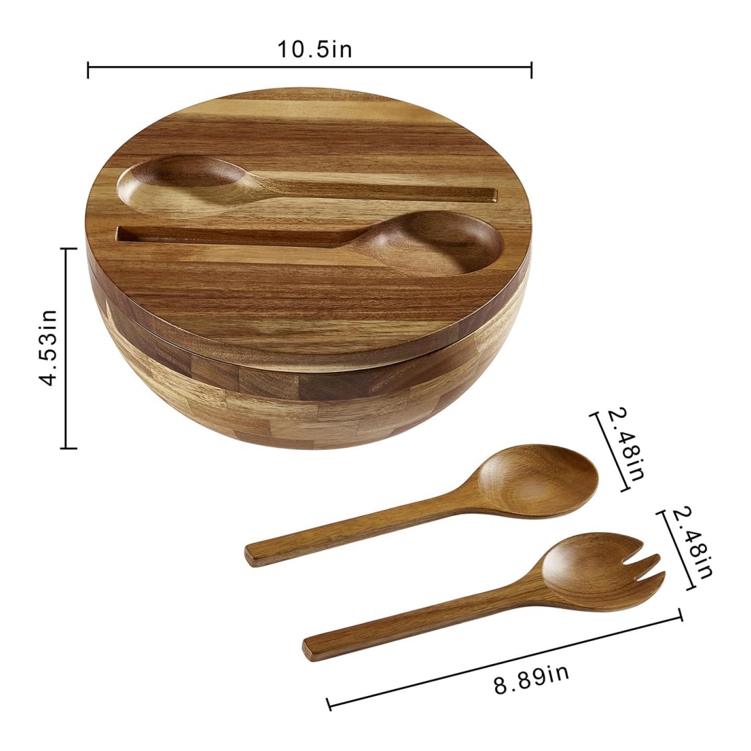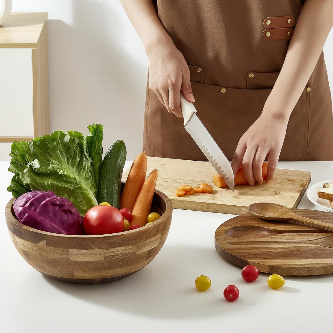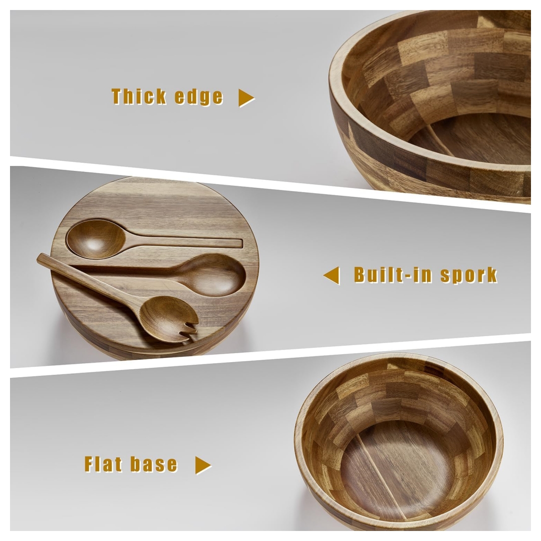 【Premium Acacia Wood】: Handcrafted from durable, natural Acacia wood, this acacia wood bowl showcases rich tones and a distinctive knot pattern that brings rustic beauty to your kitchen. Designed to last, this wooden salad bowl set is a timeless piece that complements any setting from cozy dinners to festive feasts